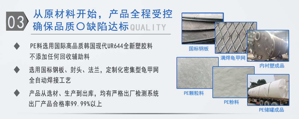 公司有鋼襯塑PE/PO、PE全塑、碳鋼、不銹鋼四大系列100多個品種,專注于常壓儲存容器生產,其產品包括鋼襯塑儲罐管口一體成型PE儲罐碳鋼儲罐不銹鋼儲罐、反應釜、攪拌罐、離子交換柱、鋼襯PE/PO儲罐塑料儲罐鹽酸儲罐硫酸儲罐等等。更大限度滿足廣大客戶的各種需求,同時可以根據客戶的需要加工定制各種防腐設備。